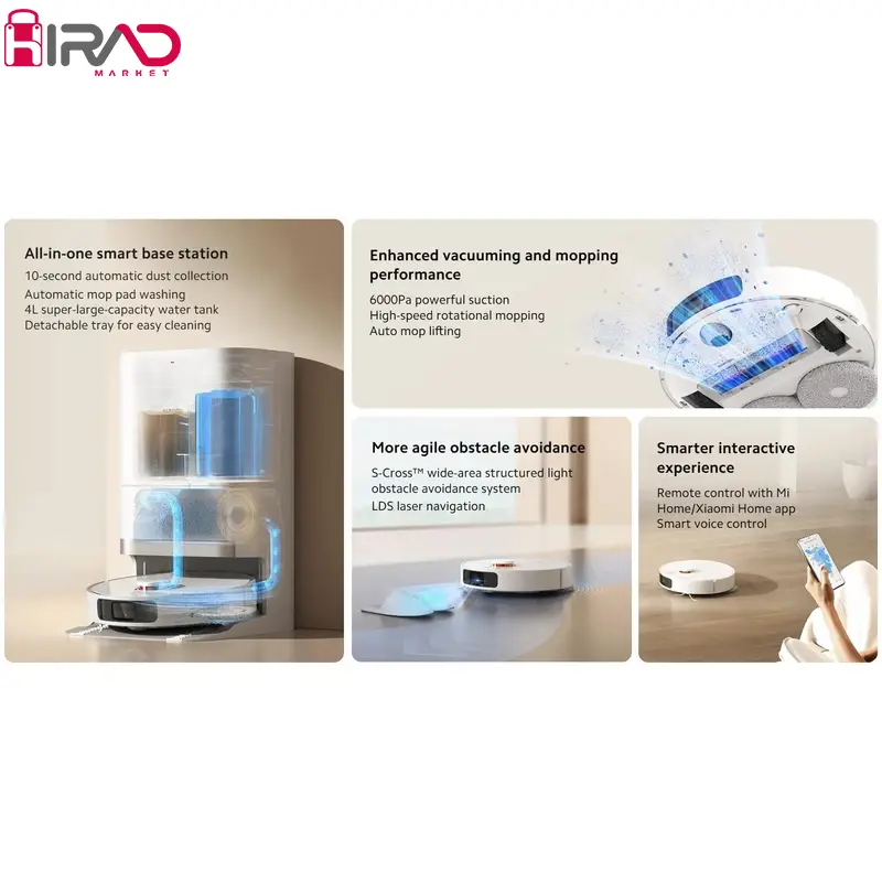 دارای سینی تمیز کننده قابل جدا شدن و شستشو -ولتاژ محاسبه شده جارو: ۱۴.۴V⎓ -توان جارو: ۷۵W – ورودی ایستگاه: ۲۲۰-۲۴۰V~۵۰/۶۰Hz – خروجی ایستگاه: ۲۰V⎓۱A – توان ایستگاه (در هنگام تخلیه گرد و غبار): ۱۰۰۰W – توان ایستگاه (در حین نظافت): ۳۰W – توان ایستگاه (خشک کردن + شارژ): ۳۰W- محتویات بسته: ربات جاروبرقی – ایستگاه همه کاره – (کیسه یکبار مصرف، مخزن آب تمیز، مخزن آب کثیف، گسترش دهنده پایه تخته شستشو، تخته شستشو گنجانده شده است) -برس -پوشش برس- محفظه گرد و غبار -فیلتر(از قبل روی محفظه گرد و غبار نصب شده است) -برس کناری – مجموعه سیم- نگهدارنده موپ پد- موپ پد (از قبل روی نگهدارنده موپ نصب شده است) -راهنمای کاربر